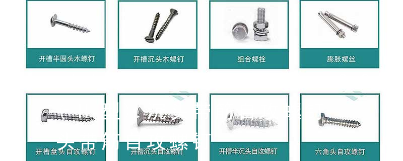 螺栓有:1、方头螺栓,2、半圆头方颈螺栓,3、十字槽盘头螺钉,4、内六角沉头螺钉,5、方螺母C级,6、蝶形螺母,7、六角头螺栓,8、十字槽盘头自攻螺钉。大小有M18、M6、M8、M16、M10、M12、M14、M20等型号。通常用 自攻螺钉选用通常的规则:自攻为4个螺距,机械螺钉为3个螺距,这是最小的旋合长度,按照实验的条件会有所加长。每一个自攻螺钉都是由头部、杆部和杆部末端三部分组成的。每一个自攻螺钉的构成都有四大要素:头部形状、扳